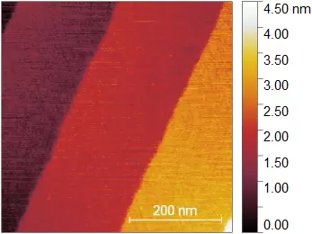 如下图所示,这是一张富睿思原子力显微镜(AFM)的扫描结果,扫描范围为500 nm的SiC原子台阶图像,台阶高度约为0.75 nm。