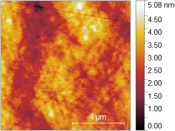 如下图所示,这是一张使用富睿思原子力显微镜(AFM)扫描SiC表面得到的图像,扫描范围为10 μm,C面的粗糙度为0.72 nm。