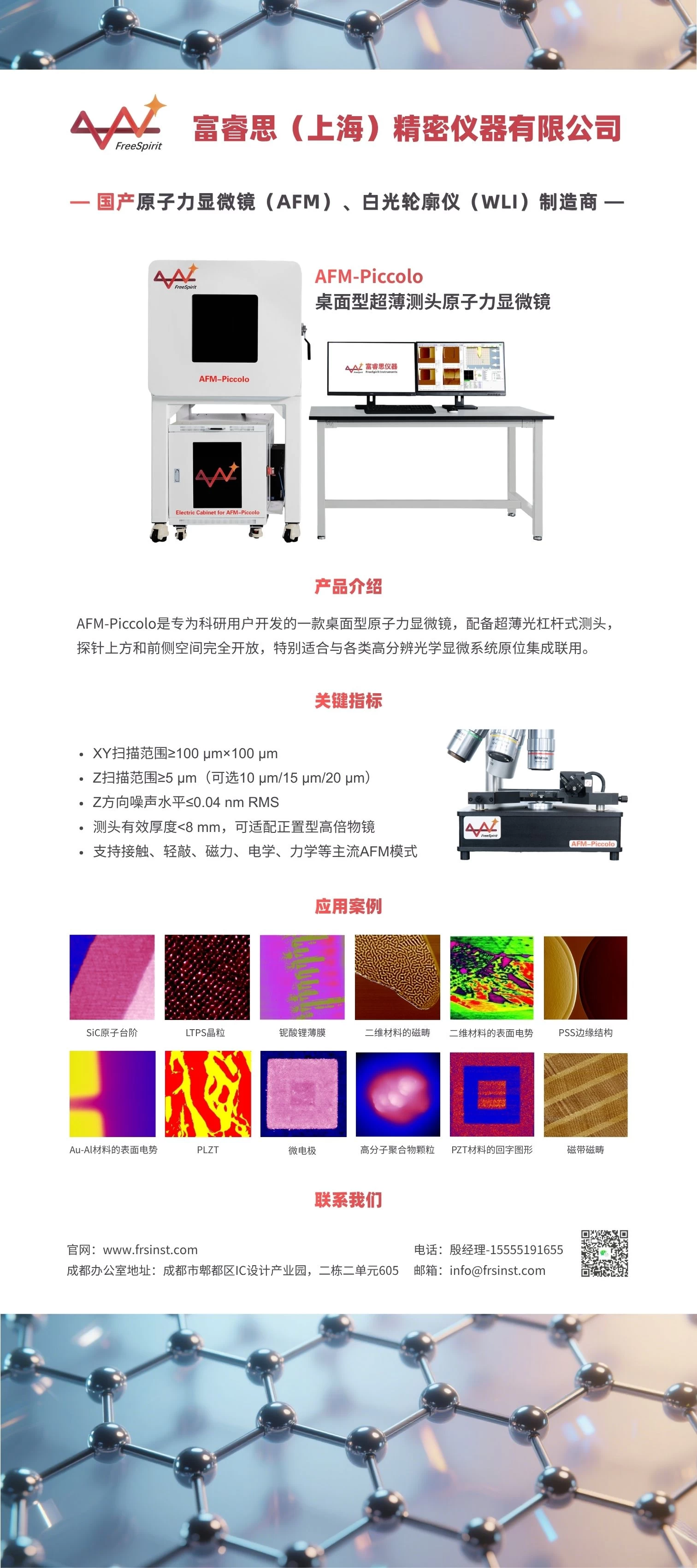 富睿思仪器(FreeSpirit Instruments)创立于2021年,是一家专注于表面精密测量设备研发与生产的高科技创新企业。立足于自主研发的技术底座,公司已成功推出国产原子力显微镜(AFM)、白光轮廓仪(WLI)以及原子力显微镜-白光轮廓仪联用系统等旗舰产品。
