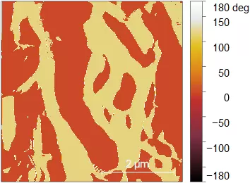 如下图所示,这是一张扫描范围为5 μm的PLZT薄膜的Lockin Phase图像,红色和黄色部分代表了Phase相差180°的不同压电畴区域。