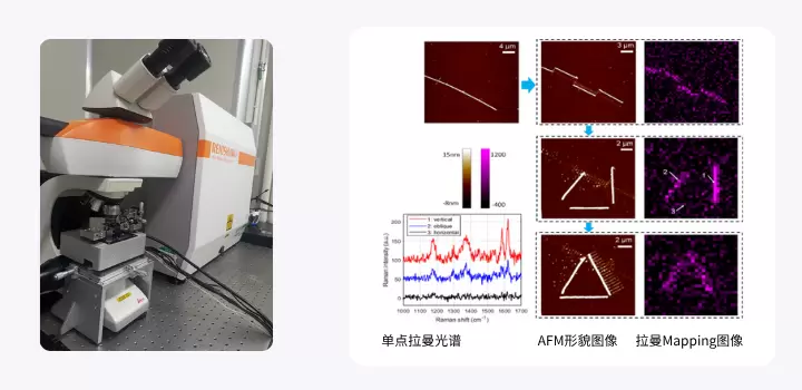 AFM-Piccolo可与拉曼显微镜原位联用,分别利用联用系统中的AFM和拉曼显微镜对分散了甲基紫分子的金膜表面的银纳米线进行原位形貌成像和光谱检测,验证了该体系下的表面增强拉曼光谱效应以及拉曼信号强度与纳米线方向的相关性。