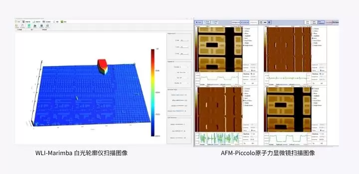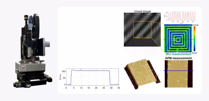 AFM-WLI Duet 利用白光干涉测头和原子力测头对栅格标样进行原位跨尺度表征,分别获得大范围三维形貌和局部轮廓及粗糙度,并实现两种量测方法对同一位置高度测量结果的比对。